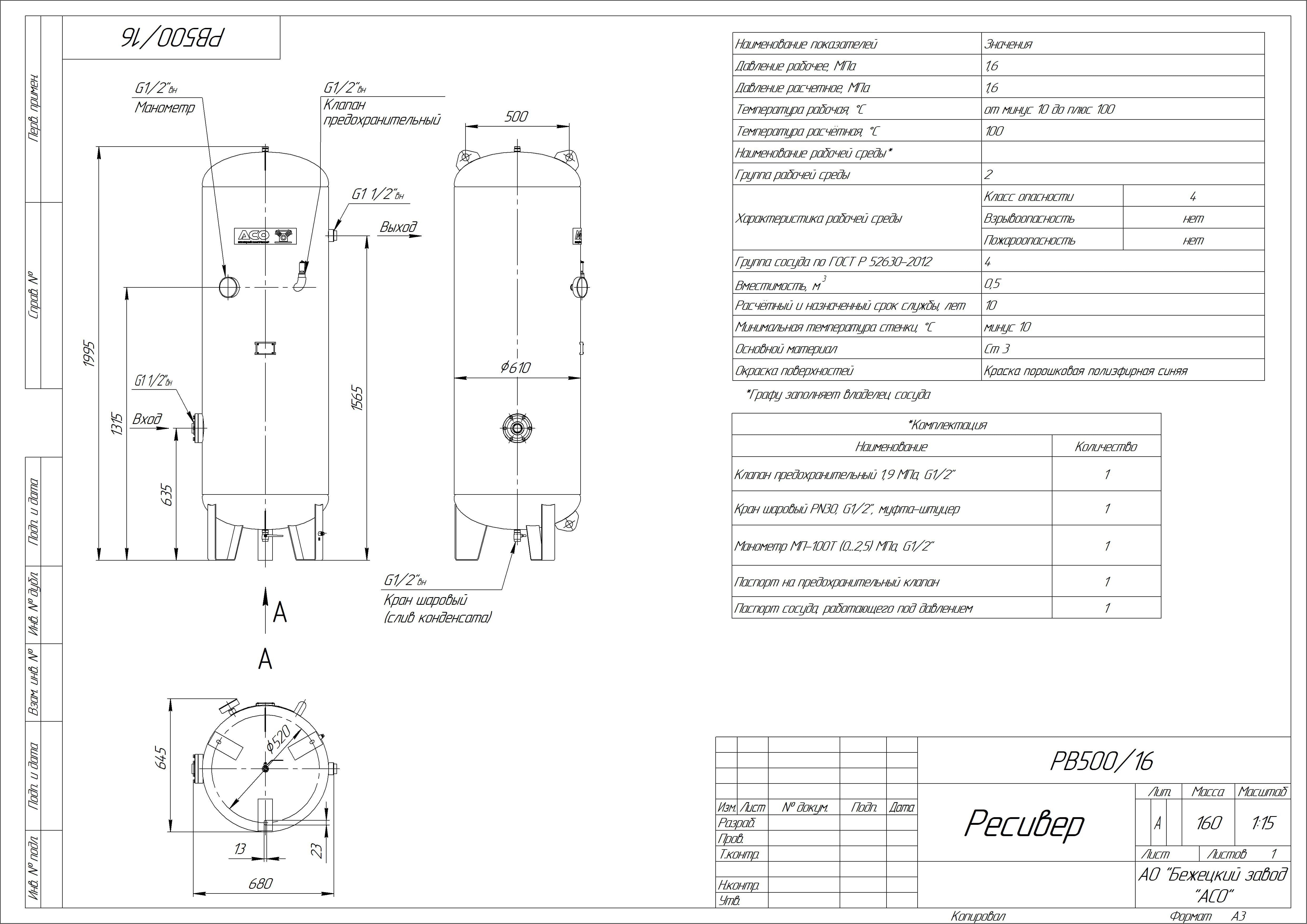 Ресивер воздушный вертикальный РВ 500/16 Бежецкого завода АСО объемом 500 л рассчитан на эксплуатацию при максимальном рабочем давлении 16 атм в диапазоне температур от + 5 до + 100 °C, изготовлен из стали Ст3пс. Габариты 68 х 65 х 200 см, масса 160 кг.Ресивер РВ 500/16 представляет собой цельносварную конструкцию из цилиндрической обечайки с приваренными эллиптическими днищами и конструктивными элементами (бобышками, кронштейнами). Установлен на приваренных опорах. Для строповки при отгрузке и монтаже имеются кронштейны.