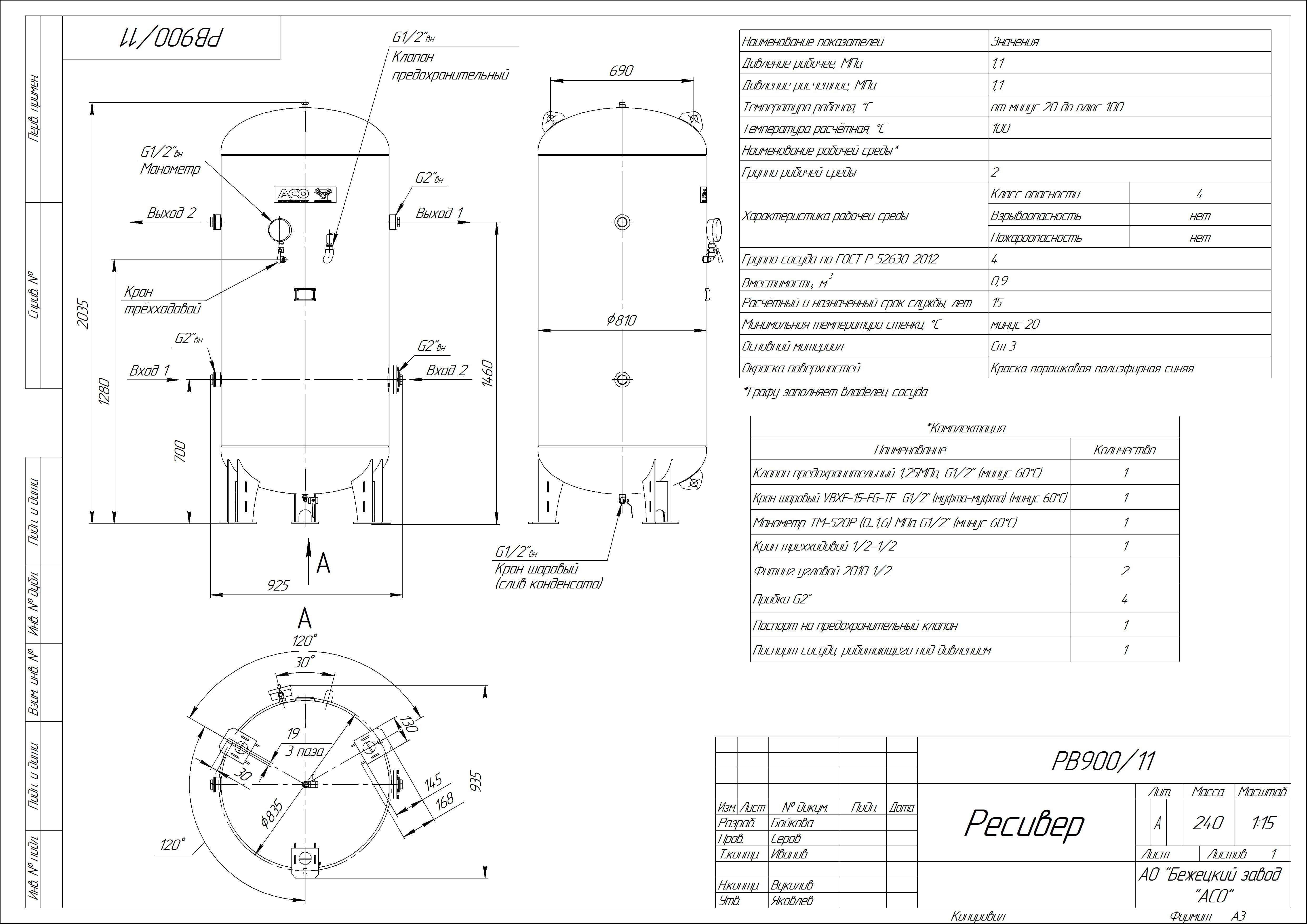 АО «Бежецкий завод «АСО», как ведущий российский производитель воздушных ресиверов, рад представить свой самый технологичный воздушный ресивер – РВ900/11, который по своим потребительским свойствам превосходит все модели, ранее выпускаемые заводом.Конструкция ресивера РВ 900/11 оснащена смотровым лючком, двумя входами и двумя выходами, что является обязательным требованием российского законодательства. Для обеспечения возможности проведения технического освидетельствования, обслуживания, ремонта и контроля состояния отдельных узлов и соединений, ресивер изготавливается в строгом соответствии с ГОСТ 34347-2017.